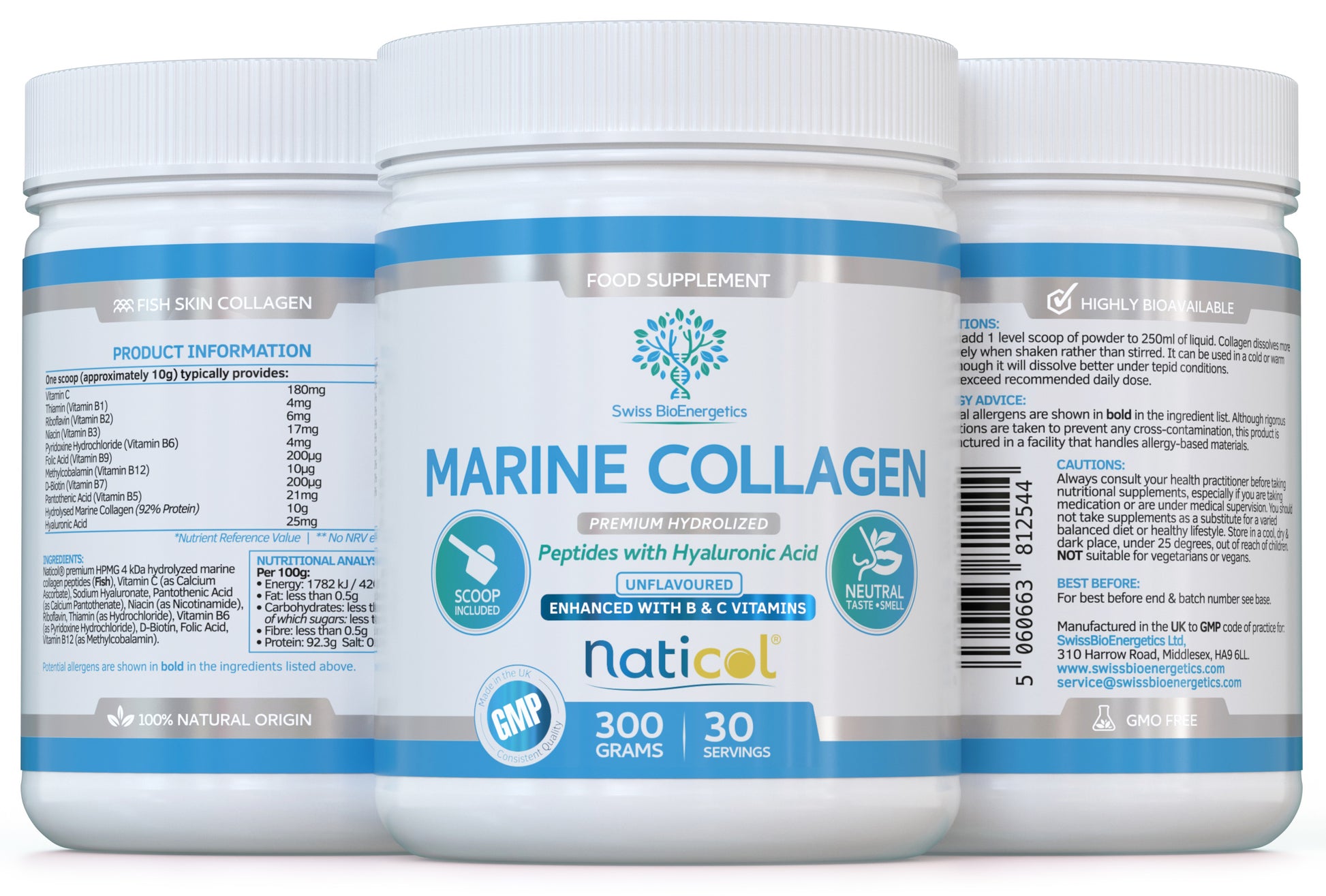 Marine Collagen Hydrolysed Peptides with Hyaluronic Acid & D-Biotin – 300g/30 servings - Unfavoured with totally neutral taste and smell - Effective Skin, Hair & Nails Formula with added C & B Vitamins - exclusively Naticol® Marine Collagen: