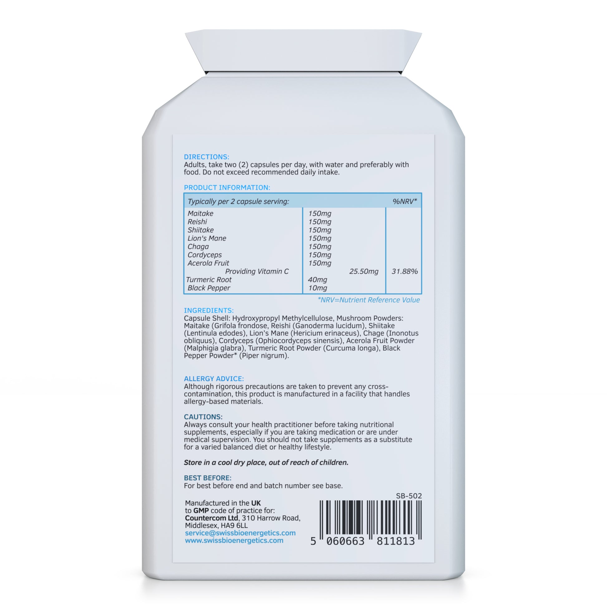 Swiss BioEnergetics Guarantees High Quality Mushroom Complex Capsules are manufactured exclusively in the UK to GMP code of practice and ISO 9001, using only the finest quality raw materials in their highest grade and purest form so you receive a consistently high quality product.